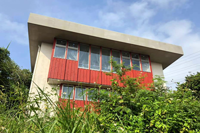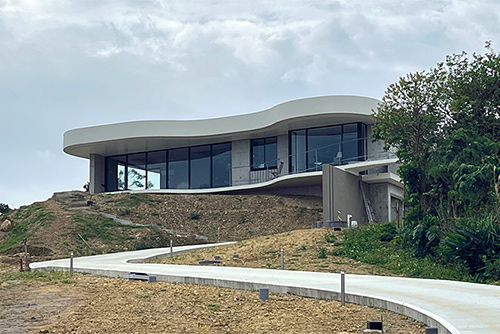 RC躯体部分と、開口の木部との対比が特徴的な、高台にある眺望の良い建築です。
